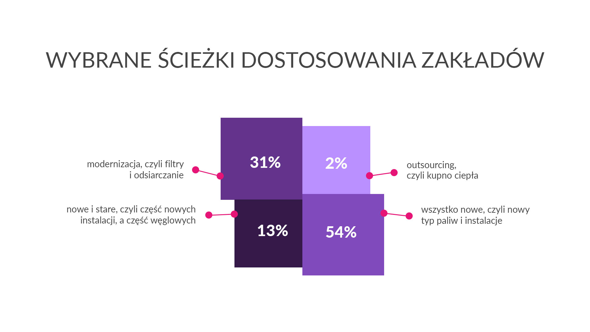 Przedsiębiorstwa wybierają różne drogi prowadzące do dekarbonizacji. Najpopularniejszą, deklarowaną przez 54% przebadanych firm, jest wdrożenie nowych instalacji oraz przerzucenia się na inny, mniej emisyjny typ paliwa. Kolejnymi są: modernizacja dotychczasowych instalacji (31%), połączenie nowych i starych instalacji (13%) oraz outsourcing produkcji energii (2%).