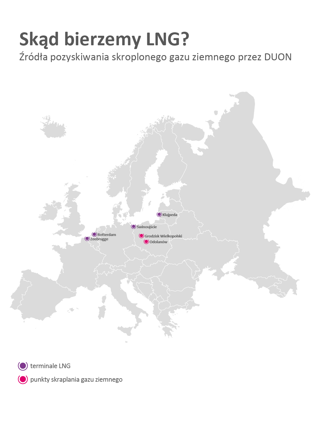 Dwa nowe terminale oznaczają zwiększoną dostępność LNG dla polskich użytkowników. Już teraz jako DUON pozyskujemy LNG w wielu gazoportach w całej Europie, a te zasilane są LNG pochodzącym m.in. z Kataru, Norwegii i USA. Za kilka lat dojdą dwa kolejne źródła w Niemczech.